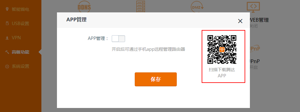 我们只需要通过手机的浏览器二维码扫描即可下载的。 当然,我们也可以通过登录路由器的管理后台下载APP。 腾达: 可以通过192.168.0.1登录路由器管理界面,在管理界面 高级功能 中有 APP管理 功能和APP二维码标识,如下图