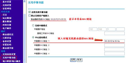 ②选择“无线基站”,在“中继器MAC地址1”中填写路由器B的MAC地址;